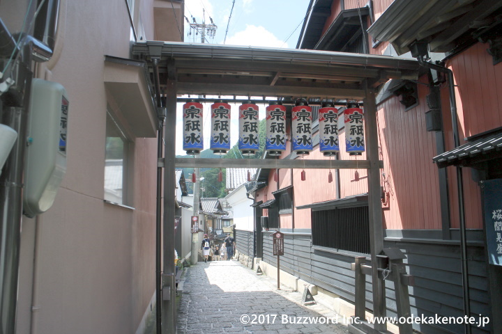 食事のあとは街の中を見物です。最初に名水百選第1号に選ばれているという宗祇水へ。飲んでみるつもりで行ったのですが、他に飲んでる人がおらずどう飲んでいいのかなと迷ってしまい断念しました。