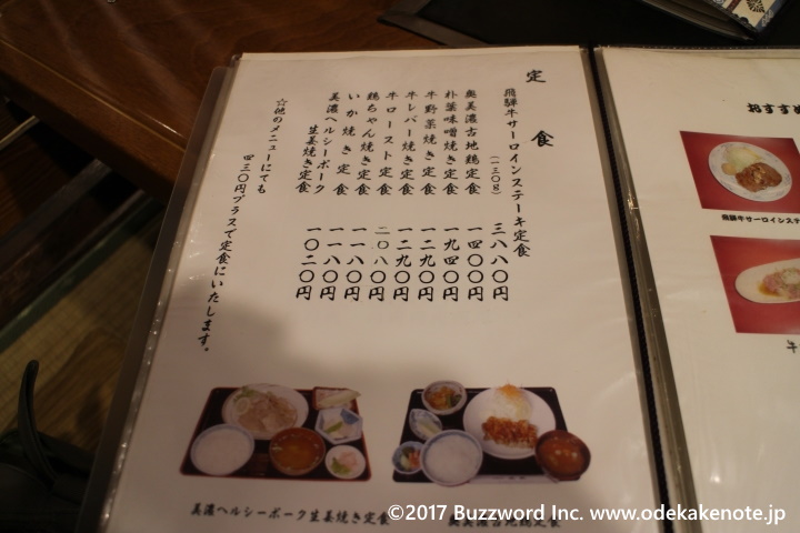 お店の中は奥に細長い作りになっていて、カウンター席と座敷の席があります。今回は奥の座敷の席に座ることができました。メニューは飛騨牛サーロインステーキなどの定食の他に一品料理もあります。