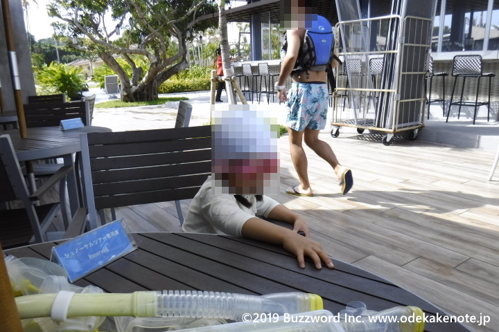 今日の午前中はホテルのアクティビティでシュノーケル体験を行います。ボートで少し沖合に出てシュノーケルを楽しむものですが、小さな娘はシュノーケルはできないのでリーフシュノーケルという小さなボートタイプの浮き輪に乗り、ボートの除き窓から海の中を見ます。昨年もこれに申し込んだのですが、娘はボートからリーフシュノーケルに乗るのを怖がって結局そのまま娘は船の上に残り、両親が交代で傍にいてあげていました。